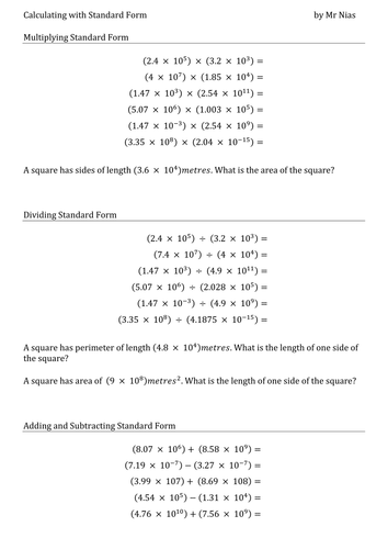 CALCULATIONS IN STANDARD FORM. Worksheets with Answers Whether you want a homework some cover work or a lovely bit of extra practise this is the place for you. E Add and subtract numbers in standard form.